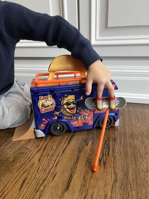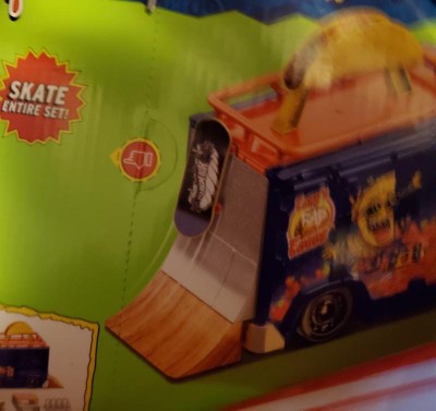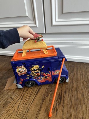 The Hot Wheels Skate Taco Truck Play Case is on the move and loaded with spicy stunt areas to slide, grind and ride. Test out new tricks and master classic ones on the giant taco or the rear ramp. Blast ollies and 360s off the picnic table. The included accessories can be stored in and on the truck for total portability. One fingerboard and pair of skate shoes are included. Additional boards and shoes sold separately, subject to availability. Colors and decorations may vary.