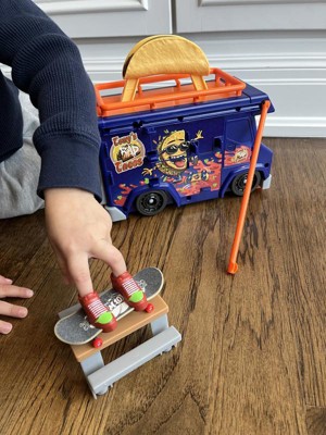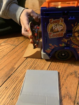 [This review was collected as part of a promotion.] THIS is awesome! Even the packaging is fun to look at!! I’m so happy that for kids the shoes for the finger skateboard fit on the board perfectly there is no frustration trying to skate on the ramp, down the rail, or over the picnic table. Endless tricks! Take this taco truck anywhere to play you can store all skate park parts inside the truck and more on the outside you can store skateboards. We will be buying for skateboards for this set very soon.