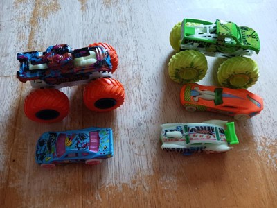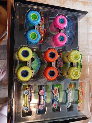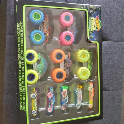 [This review was collected as part of a promotion.] This is a terrific set of cars and monster trucks!! There are 5 cars and 5 monster trucks that are all the great HotWheel quality you are used to. The designs are all fun for boys and girls. My kids favorite aspect is that they glow in the dark too - bonus!!! The cars are pretty standard with fun paint designs. I really like the monster trucks and how well they zoom across the floor.