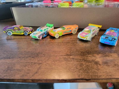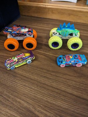 [This review was collected as part of a promotion.] These hot wheel race cars and monster trucks are fun. They don't glow in dark as well aa we hoped but the bright colors are very appealing. We love doing races between the monster truck and the race cars.