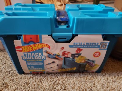 Hot Wheels Track Builder Stunt Crash Box Set with 18 pieces, storage box & 1 car — fun gift for kids ages 6–12 for racing & creative track building