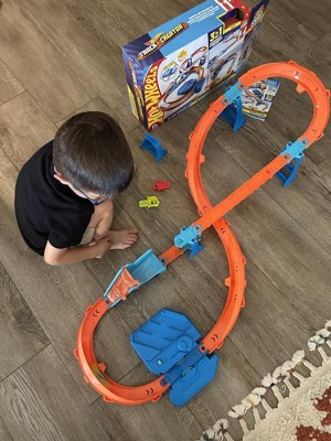 - Race into an epic Hot Wheels track build with a deluxe Track Creator set featuring a motorized booster and 1:64 scale Hot Wheels car.