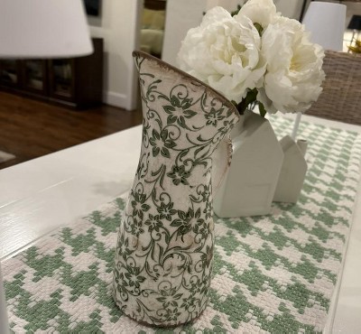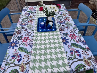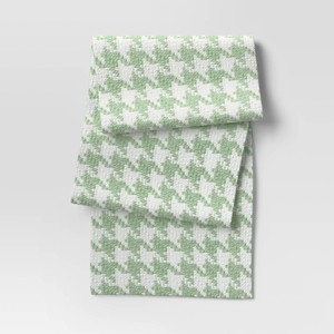 A: The table runner features a light green houndstooth pattern on a white backdrop.