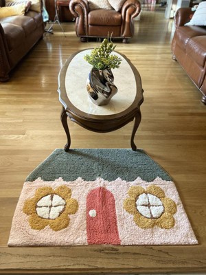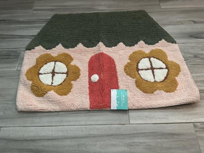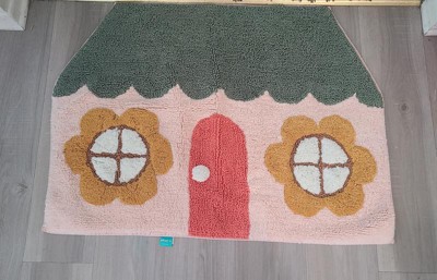 Add a playful touch to your kid's room with this House-Shaped Kids' Accent Rug from Pillowfort™. This tufted rug is designed in the shape of a house featuring a green roof, red door and floral windows for a whimsical look. Made of 100% cotton, this medium-pile rug offers soft comfort underfoot, and it pairs well with a variety of decor styles. Plus, it's machine washable for easy cleaning.