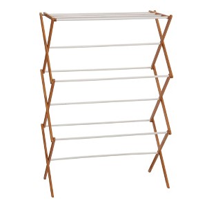 - This rack is made of elegant bamboo, a sustainable and renewable resource, with a shelf for flat drying sweaters and similar articles.