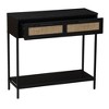 This timelessly versatile 2-tier console table radiates a cozy modern feel with its breezy aesthetic and imaginative, textural twists. Display decorative accents, books, and small plants for a bold pop of color, or leave bare as a sophisticated statement piece, a perfect drink perch behind a loveseat during cocktail parties. The functional drawer with mock rattan detailing will fashionably conceal odds and ends, resulting in a beautiful storage solution. Console table is made from sustainable particle board and measures 31.25" W x 11.625" D x 29.375" H. Equipped with adjustable feet to stabilize and protect floors.