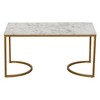 This timeless, architectural coffee table will elevate any living space with its clean lines, clever design, and contrasting hues. Display decorative accents, books, and small plants for an eye-catching pop of color, or leave bare as a sophisticated statement piece, perfect for a mid-day coffee break or casual evening cocktail hour. The versatile colors and elegant curved base will carry this table through any style transition, and can be paired with the half-moon accent table as a nesting set, perfect for entertaining. Coffee table is made from sustainable particle board and measures 39" W x 21" D x 19" H.