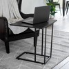 This modern C table with fold out sides is an attractive, simplistic and functional end table or accent piece for any home. This piece has a compact footprint that is especially useful in compact living quarters like apartments, townhouses or dormitories. Instead of taking up valuable space on your floor, the unique and versatile shape of the table base is designed to slide under chairs, couches or other low clearance pieces of furniture. In addition, the top of the table folds out to twice its size to double our surface space! The table serves as an excellent surface for laptops, paperwork or homework. It can also act as an extendable TV tray or drink stand come dinnertime. In a more permanent setting, the table can be a decorative stand for lamps, framed photos or other home decor items. This C table weighs just 7 pounds, easily moved from one side of the room to another, or from one room to another when necessary. The table is built from a sturdy metal frame with adjustable feet to ensure a perfectly level surface at all times. Its height is perfect for comfortable use with most conventional couches. Atop the frame is a solid MDF surface with a sleek black hue. This C table can be up and ready to use in no time, thanks to its easy assembly.