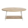 This oval coffee table is a wonderful addition to any home or space. Its low profile and slim design make it perfect for use as a coffee table, but it could also be used as a side table, as an end table, or elsewhere in the home. The table has a lower storage shelf for ample space to store coffee table books, magazines, remotes, coasters, and any other items you want to keep handy or on display. The table’s oval top and rectangular shelf make for an interesting and modern look. The table has a steel frame with slightly angled legs for a look reminiscent of mid century modern design. The tabletop and shelf are made of durable engineered wood with a smooth laminate exterior. The lightweight materials and frame keep the table durable without being heavy, weighing just under 25 pounds, and the laminate makes the table’s surface much more durable and easier to care for than real wood. To clean, simply wipe the surface with a damp cloth. The laminate has a faux two tone woodgrain finish with stylish and purposeful distressing for a worn, restorative look. Because the distressing on each piece is unique, your table may vary slightly from the photo examples. The mix of cool-toned faux wood and white metal make for a sleek and chic design. The table comes ready to assemble and is easy to put together. This table coordinates with other pieces in the Household Essentials Coastal Oak collection.