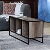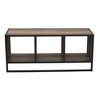 Reimagine living room storage with the Household Essentials Ashwood Open Cubby Coffee Table--a sleek coffee table 3 dividers underneath that create 3 storage cubbies. The table is 19.1 inches high x 42.7 inches long x 13.8 inches deep, making it ideal for most sofa styles with seats 20-22 inches high. Its narrower footprint make is perfect for smaller living areas and apartments. Its 3 storage sections underneath are approx. 12.5 inches tall x 12.9 inches wide x 13.8 inches deep, perfect for storage bins or baskets and are just the right size to fit LP records. Use this coffee table in the living room or as a window storage seat, The table has the ashwood finish, a distressed wood grain laminate that looks like reclaimed wood--slightly gray tones and quite lovely. 0