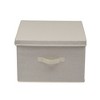 This versatile and stylish canvas storage box with lid offers exceptional organizational possibilities for any closet or storage area in your home. Its classic design and natural color offer an aesthetically pleasing alternative to oft-cluttered areas of your home. The box is made of a durable poly-cotton canvas blend and is reinforced with sturdy cardboard for added stability, durability, and stackability. The material offers exceptional protection from dirt and other common household elements that can damage your stored items. At the same time, the material is breathable, so your woven items won’t become stale or odorous regardless of how long they’re stored. For added convenience, each box includes a single decorative for easy and immediate, one-handed access when stored on a tall shelf or under a bed. These large storage boxes offer a functional and stylish solution for any home storage application. Bedrooms, bathrooms, attics, basements--these boxes offer simple storage when and where you need it. They are perfect for blankets, accessories, off-season clothing, towels, craft supplies and anything else in need of order and organization. When not in use, the box can be folded flat and tucked away as to not occupy excess space in your home’s closet or storage area. Decorative and practical, this storage box with lid is the perfect way to get your clutter organized and out of the way. The product dimensions are 10 inches high, 15 inches wide, and 15 inches deep.
