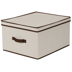 This large storage box with lid offers an abundance of accessible and versatile storage space. With its charming exterior and sturdy construction, this storage box can be used in any room of the home to cut down on clutter and organize your living space. Offered in a jumbo size for the utmost storage capacity, this elegant storage box has an unlimited amount of storage potential. The solid sides and reinforced base provide an ample amount of protection to the contents. The canvas is made of a poly-cotton blend--soft to gently cradle delicate items, but durable to prevent snagging and stand-up to daily use. The natural color of this canvas can easily be paired with your style at home, while the coffee trim provides wonderful contrast. To maximize space, this large storage box can be stacked or folded while not in use. The fully removable lid offers quick and easy access to all of the items stored, making it perfect for both short and long term storage. The single front handle is a convenient way to pull this box out from shelves or cubbies. This large canvas storage box can be used for large, awkwardly sized items or an abundance of smaller items. Use this storage box in the closet to hold seasonal gloves, jackets, boots, scarves, blankets and other accessories. It could also be used in the crafts room to hold extra fabric, yarn or boxes of beads and buttons. This could also be used in the bathroom pantry to hold washcloths, towels and toiletries.