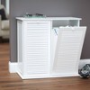 HOUSEHOLD ESSENTIALS Tilt-out Cabinet Laundry Sorter with Shutter Front makes necessary extraordinary. Designed as a quality addition to your home, this furniture sorter attractively and discreetly hides your dirty laundry behind a clean white cabinet. The shutter front is a beautiful bit of detailing that makes the piece interesting. Tilt-out doors optimize space and keep laundry day simple. The washable hamper liners fit over wood handles that rest on the hamper’s built-in frame. Handles make it easy to lift out the hampers, as does the doors efficient tilt-out design. Make this piece a stylish addition to your home, and make laundry day less of a chore. This attractive, shutter-front sorter is 28.75 inches high, 30 inches wide, and 15 inches deep.