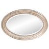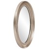 The Ethan Mirror features a stunning champagne silver finish. The oval frame is accented with grooves and a ribbed center for added depth and character. Its Transitional style makes this mirror a favorite for bringing some flair to your decor. This simple yet stunning piece would be a great addition to any room. It is a perfect focal point for an entryway, bathroom, bedroom or any room in your home. D-rings are affixed to the back of the mirror so it is ready to hang right out of the box in either a horizontal or vertical orientation! Dimensions 31H x 21W x 2D