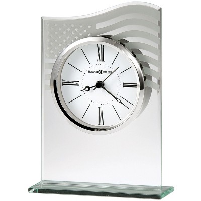 TABLE CLOCK: The Granby Alarm & Table Clock is a jade glass clock that features a curved top, tapered sides, and beveled base with side and center panels to complement your home decor. The clock's quartz movement makes a soft ticking noise without the use of chimes for a quieter environment. DURABLE: This indoor modern clock is created to last. It has a sturdy frame to relieve stress in a busy household. Display it in your kitchen, office, bathroom, bedroom, living room, and more to fit in a small space for a clean look. HIGH QUALITY: This clean design shows traditional Roman numerals, with IIII instead of IV, to become a home essential. Easily tell time with black hour, minute and second hands, silver alarm hand, glass crystal, and a polished silver-tone bezel to stand out over a white dial. MOVEMENT: It is powered by quartz and alarm movement, and requires one AA sized battery. HOWARD MILLER: Founded in 1926 and still family-owned in its third generation, Howard Miller is the world's leading clock company and a respected brand name in fine specialty furnishings such as curio cabinets, wine & bar furnishings, custom storage cabinets, and SmartMoves adjustable height desks.