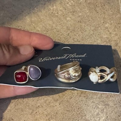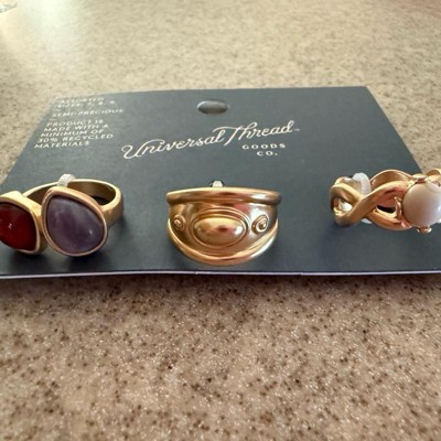 Refresh your accessory collection with the 3-Piece Embellished Ring Set from Universal Thread™. This set includes three rings — one featuring a white howlite stone, another ring with two lepidolite stones and one adorned with beautiful raised designs — for a classic look. Designed in a gold finish, these rings are a versatile addition to your everyday jewelry collection.