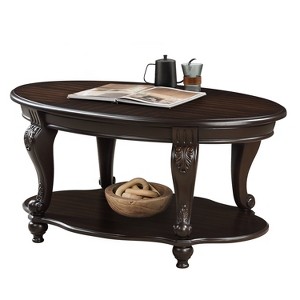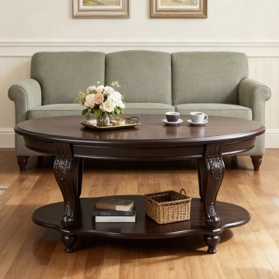 American-style coffee table crafted from wood veneers, solid wood, engineered wood, and cast resin. Features a fixed lower shelf, antiqued two-tone finish, rounded corners, clean lines, and unique floral carvings for classic charm. Solid rubber wood legs (not particle board) ensure stability and durability; MDF top/shelf with wood veneer (not stickers) resist scratches and heat. Oval shape adds safety for families. Measures 42"W x 26"D (top), 37.4"W x 24.4"D (shelf), 20.5"H, fitting small/large living rooms. Holds 397 lbs (top), 132 lbs (shelf). Easy assembly with instructions, hardware, and tools included—just attach shelf and legs.
