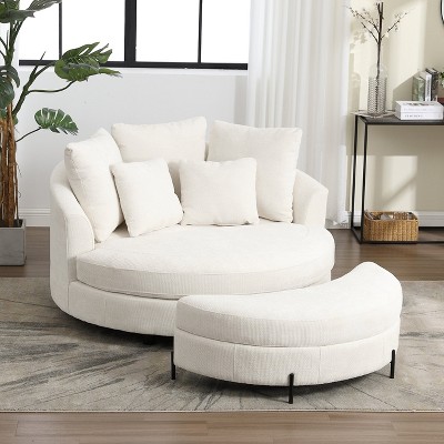 Hrinhom 59.8"W Slipcovered Barrel Sofa Chair,Modern Upholstered Chenille Accent Chair With 5 Pillows-BEIGE