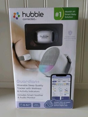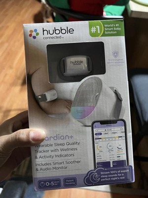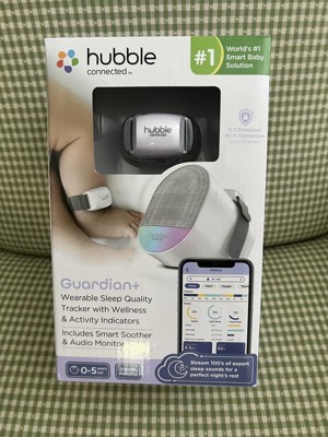 The Guardian Cam offers parents valuable insights into the well-being of the baby, as well as the ability to stay connected via live video monitoring from the palm of their hands. This package includes the award-winning Guardian+ smart movement monitor, an HD camera and a smart sound machine with nightlight. The ankle sensor tracks vital information such as heart rate, blood oxygen levels, movement and activity levels, body temperature change, and provides an exclusive Hubble Sleep Score for comprehensive sleep analysis. The base station serves as a charging unit for the sensor, a nightlight, and a smart sound machine all in one, while the HD camera provides crystal clear images of baby, which can be viewed via the HubbleClub app on your smart device, along with all the wellness indicators.