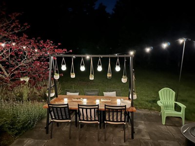 The design is awesome. Just the right mix of wood, metal and a little eclectic design with a top bar for hanging plants, dried flowers or party lights. Anything you can imagine. We used outside furniture oil and gave all the wood a good coat. Found some benches with same eclectic design. Now it’s our regular spot at night.