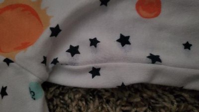 Overall, love them, but the white one with the stars ans planets, it's printed, which is fine, but ours is smudged. The stars all down one side of the shirt look like the print got dragged. It's NOT running dye, so not getting on other stuff, or getting worse. However, this is a no returns item, so buy at your own risk.