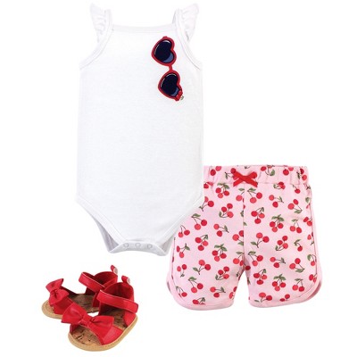 Hudson Baby Infant Girls Cotton Bodysuit, Pant and Shoe 3pc Set, Cherries, 3-6 Months