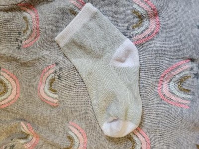 I purchased size 12-24 months for my 7 month old because she has chunky ankles/calves and I wanted the socks to fit her legs without cutting into her. Her foot measures 4 inches from her big toe to her heal, and these are just a little long on her foot, but do stay on. I was surprised that a larger size fit her little foot so well because her foot is so small. So these socks seem to run a little small and you may want to size up. These socks do not have slip grips on them, which isn't a problem for us right now because our daughter isn't walking yet at 7 months, but I would like to see socks that fit walking 12-24 month olds with slip grips. The colors of these socks are a little strange to me with the gray being more like an olive green and the pink is almost like a neon pink instead of a baby pink. I tried to show the colors in the pictures compared to an outfit with a true gray color, but I just couldn't get the color right in the photo.