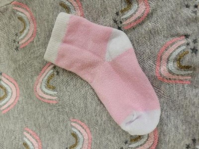I purchased size 12-24 months for my 7 month old because she has chunky ankles/calves and I wanted the socks to fit her legs without cutting into her. Her foot measures 4 inches from her big toe to her heal, and these are just a little long on her foot, but do stay on. I was surprised that a larger size fit her little foot so well because her foot is so small. So these socks seem to run a little small and you may want to size up. These socks do not have slip grips on them, which isn't a problem for us right now because our daughter isn't walking yet at 7 months, but I would like to see socks that fit walking 12-24 month olds with slip grips. The colors of these socks are a little strange to me with the gray being more like an olive green and the pink is almost like a neon pink instead of a baby pink. I tried to show the colors in the pictures compared to an outfit with a true gray color, but I just couldn't get the color right in the photo.