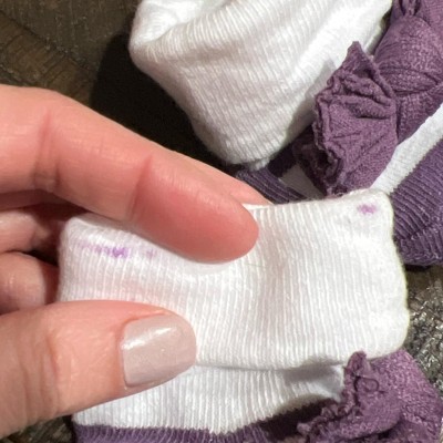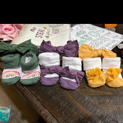 Adorable sets of socks and headbands. However, the purple set has purple staining around the cuff of one sock.
