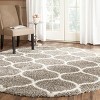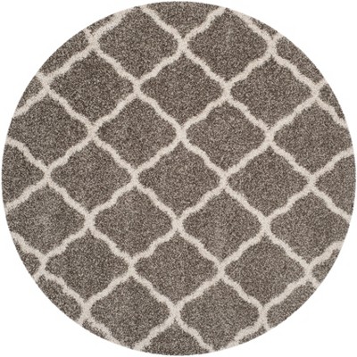 The round shape of this rug adds a harmonious dimension to any room, while the chic grey and ivory hues create a versatile backdrop that seamlessly complements a variety of decor styles. Its striking pattern showcases a series of interconnected trellis designs, adding visual interest and contemporary charm to your home. Whether placed in a living room, bedroom, or under a dining table, this rug will be the centerpiece that brings together style and function. Indulge in the shag style comfort and artistic flair of this magnificent area rug, and let it transform your space into a haven of style and relaxation.