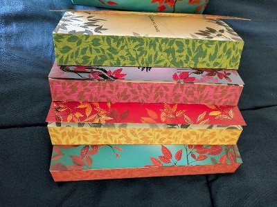Beautiful box set! Not sure about people saying that they are too pretty for the series and all that since the art is mostly leaves like the forest Katniss loves, but I love them. They are paperback and all have a leaf theme throughout. Book covers are slightly textured on the leaves. Can't wait to start reading!