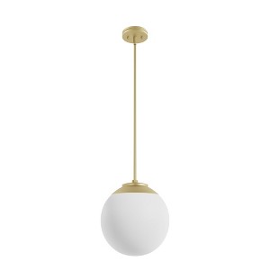 The white-cased glass orb of the Hepburn pendant will wow your guests in your foyer or dining space. The artful simplicity of the deco style of this light fixture is an elegant fit for any room. The addition of new finishes to choose from adds a modern edge to this classic style. This light is perfect for mixing and matching with lights from our other collection or simply adding others from the Hepburn collection for a cohesive design.. Rated for indoor use only. Requires 1 E26 bulbs. Bulbs not included.. MADE FOR INDOORS: For use in indoor spaces like kitchens, bedrooms, living rooms, dining rooms, and entryways.. BULB RECOMMENDATION: Maximum 60 W per light bulb or equivalent LED bulb. Bulbs not included.. CUSTOMIZABLE HANGING OPTIONS: With the minimum required downrod, the hanging length is inches. When using all of the included downrod, the maximum hanging length is inches.. WARRANTY: One-year limited warranty backed by the trusted experts at Hunter.,