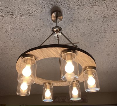 [This review was collected as part of a promotion.] This Chandelier is gorgeous! I love the farmhouse design of it. With the ball jars to the textured light wood and the brown accentuating through the chandelier base. The colors blend well together and it’s simple and gorgeous. The jars are a great size and will fit most lightbulbs. The chandelier is well built and made to last. Can’t wait until it’s installed. Would definitely recommend!