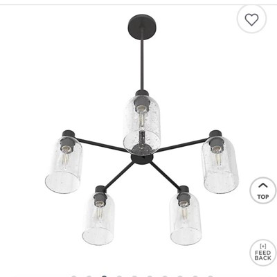 [This review was collected as part of a promotion.] Simple yet magnificent 5-light chandelier Clear glass dome shades that leave an impression without being overpowering Rated for indoor use Requires five E26 light bulbs (bulbs not included) Maximum 60-watts per light bulb or equivalent LED bulb Includes one 6" downrod and four 12" downrods for height adjustments between 21" and 69" Hardwire installation Accommodates flat ceiling Metal/glass Measures 26" L x 26" W x 19" H Weighs 10.5 lb