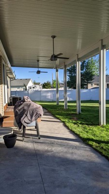 Outside screen room installation. Looks nice. Blade installation with two piece screws can be challenging. Use the 4 screws without washers on the plastic light cover.