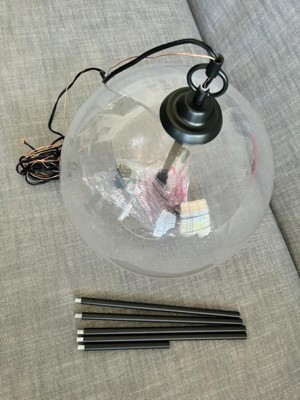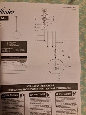Transition the look of your kitchen or dining room with a lighting fixture so gorgeous, the transformation might seem a bit like magic. Hunters High Oaks pendant creates an incandescent, formal feel with its trio of soft lights floating in a glass orb. The High Oaks pendant will brighten your space in breathtaking style. Rated for indoor use only Requires 3 E12 bulbs. Bulbs not included. MADE FOR INDOORS: For use in indoor spaces like kitchens, bedrooms, living rooms, dining rooms, and entryways. BULB RECOMMENDATION: Maximum 60 W per light bulb or equivalent LED bulb. Bulbs not included. PICTURED HERE: Match our image using B10 Candle light bulbs. CUSTOMIZABLE HANGING OPTIONS: With the minimum required downrod, the hanging length is 25.5 inches. When using all of the included downrod, the maximum hanging length is 73.5 inches. WARRANTY: One-year limited warranty backed by the trusted experts at Hunter. Mounting Direction: Down / Assembly Required: Yes / Canopy Included: Yes / Sloped C