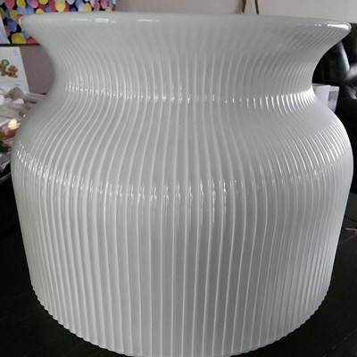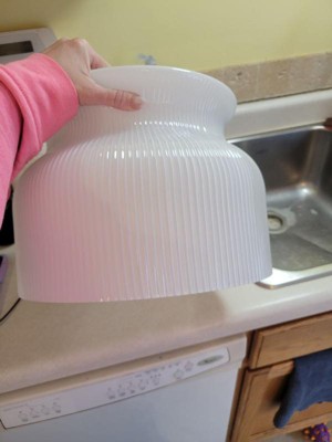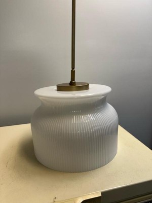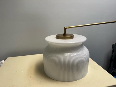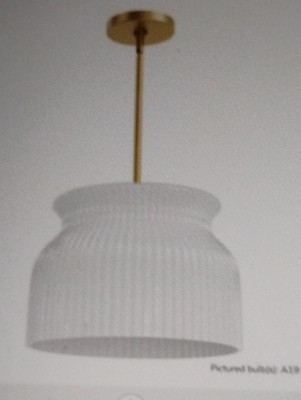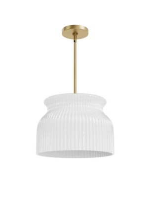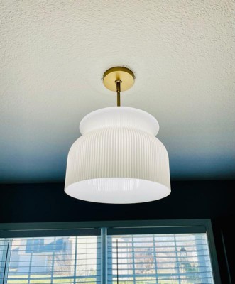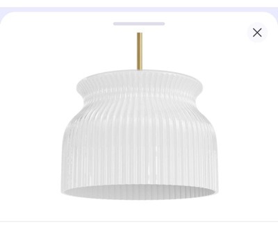 [This review was collected as part of a promotion.] I love this new night fixture. The quality is beautiful. The white ribbed glass and the gold hardware is such a good combination. The size is great with lots of options for hanging length. It lets off lots of light for just one bulb. However this was very difficult to install. It is a two person job and the instructions are all written out with no picture description for each step.