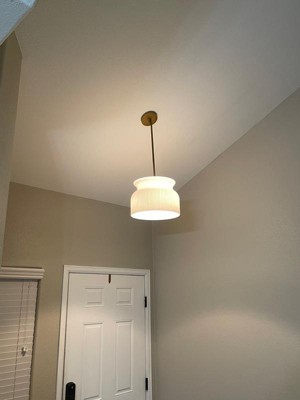[This review was collected as part of a promotion.] I love this light fixture! The white shade looks like milk glass. It goes really well with the gold hanging rod. It’s lighter than I expected, but still thick and feels like good quality. The mounting pieces screw into one another to adjust the hanging height. I do wish there had been one more shorter piece included.