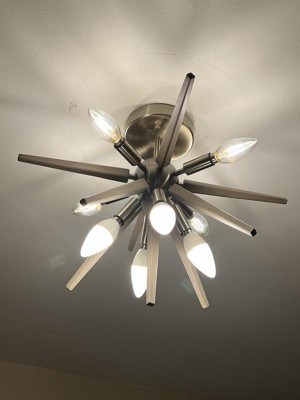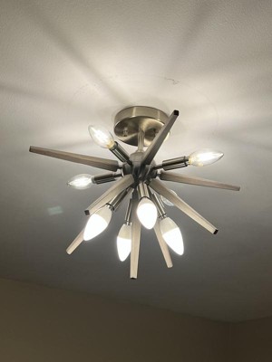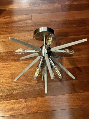 [This review was collected as part of a promotion.] Jupiter Star Semi-Flush Mount light fixture, looks great in my bedroom. It comes with everything you need to attach it to an existing ceiling fixture mount. The light bulbs and the decorative spike pieces screwed in easily to the fixture. And I just love the updated look the Jupiter Star gives to my bedroom, it is very stylish. The light gives off lots of light, so you can either use lower wattage bulbs or add a dimmer light switch. I really liked the idea of adding dimmer switch so I can take advantage of all the light it puts off. I could also see using this in my foyer or ktichen!