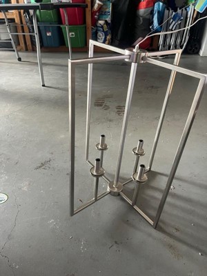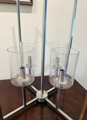 The geometric shape of metal and seeded glass of the Kerrison 4 light pendant combine to add a unique design to your foyer. This fixture offers a welcoming glow to all who enter. Spread the light throughout your home with other lights from the Kerrison collection. Rated for indoor use only Requires 4 E12 bulbs. Bulbs not included. MADE FOR INDOORS: For use in indoor spaces like kitchens, bedrooms, living rooms, dining rooms, and entryways. BULB RECOMMENDATION: Maximum W per light bulb or equivalent LED bulb. Bulbs not included. PICTURED HERE: Match our image using B10 Candle light bulbs. CUSTOMIZABLE HANGING OPTIONS: With the minimum required chain, the hanging length is 29 inches. When using all of the included chain, the maximum hanging length is 173 inches.,