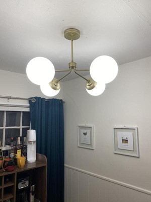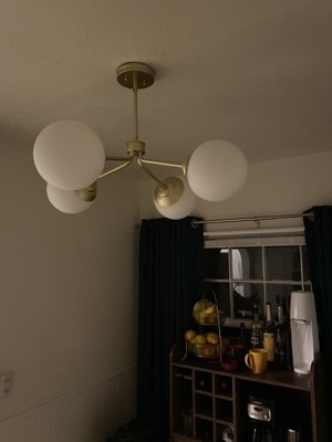 [This review was collected as part of a promotion.] This 4 light chandelier will create a modern twist on any room. If you are trying to create a calm, serene mood then look no further. You can create an old world feel with new lighting choices. It has 4 white globes and brass fixtures. It should go with any design theme you have in your home. It should not be used in bathrooms.