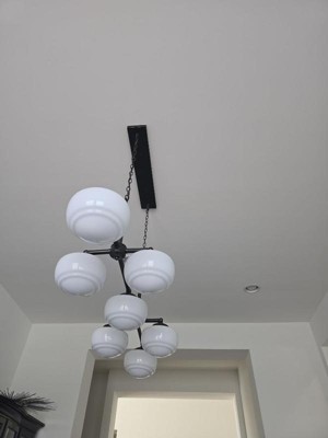 With its modern take on schoolhouse style, the Saddle Creek 7 light linear chandelier might be the perfect fixture for your home�s dining room or kitchen. Artfully arranged glass globes offset the chandelier�s simple metal finish, creating a piece elegant enough to accent a formal dining room yet casual enough for a kitchen island. The Saddle Creek offers a fresh look at a classic design. Rated for indoor use only Requires 7 E26 bulbs. Bulbs not included. MADE FOR INDOORS: For use in indoor spaces like kitchens, bedrooms, living rooms, dining rooms, and entryways. BULB RECOMMENDATION: Maximum 60 W per light bulb or equivalent LED bulb. Bulbs not included. CUSTOMIZABLE HANGING OPTIONS: With the minimum required chain, the hanging length is 23.5 inches. When using all of the included chain, the maximum hanging length is 96.75 inches.,