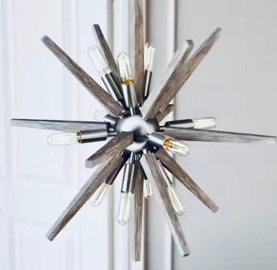 Wishes do come true! The Jupiter Star 12 light 18 inch pendant is the answer to your cravings for a light that wows. The starburst light made with wood-inspired material is a stunning fixture with a mid-century vibe. Rated for indoor use only Requires 12 E12 bulbs. Bulbs not included. MADE FOR INDOORS: For use in indoor spaces like kitchens, bedrooms, living rooms, dining rooms, and entryways. BULB RECOMMENDATION: Maximum 60 W per light bulb or equivalent LED bulb. Bulbs not included. PICTURED HERE: Match our image using T6 Tubular light bulbs. CUSTOMIZABLE HANGING OPTIONS: With the minimum required downrod, the hanging length is 28 inches. When using all of the included downrod, the maximum hanging length is 76 inches.,