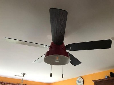 [This review was collected as part of a promotion.] I wasn't sure how this fan would look indoors since it's advertised for outdoors but it looks great in our kitchen! I can see how it would look nice over a porch or screened in the area though. It's is very large (52 inch) so it's best in a large room. Also, it's only meant for average height ceilings, not super high. The picture of it looked like a dark red but it's actually a bright red which is nice. Just be prepared if you don't like bright colors. It was fairly easy to put together and runs nicely. It comes with a light and you 2 different color blades. They are 2 different shades of brown on each side. This is really attractive looking and I would highly recommend this.