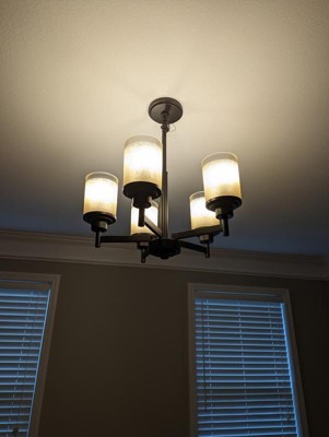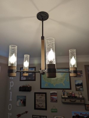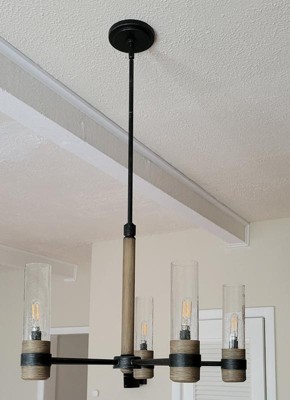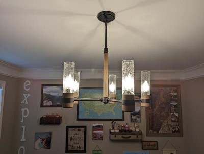 [This review was collected as part of a promotion.] This is an easy chandelier to install. Comes with everything that is needed except for the light bulbs. It came with five different rods so you can adjust your height to where you want it. As you can see in my pictures I chose the shortest. You do have to cut the cable and adjust everything to the size that you're going to use. But with all that said, installation was very easy. I love the rustic look. It goes with the theme of our dining room. The glass for the lights has got bubbles in it so it's actually really flattering when the lights are on. This is an easy way to class up a room.