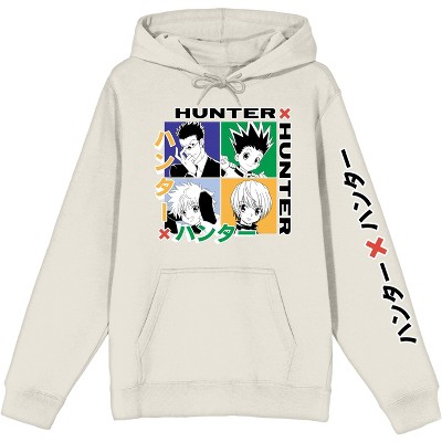 Show off your love for anime with this adult black Hunter x Hunter long sleeve hooded sweatshirt. Featuring Gon Freecss, Killua, Kurapika, and Leorio in colorful panels surrounded by white title text, plus the series logo on the left sleeve, this hoodie delivers bold fan style. The adjustable hood adds versatile coverage, while the cotton and polyester blend provides comfort and durability. Machine wash it on cold with like colors and tumble dry on low heat for hassle-free care.