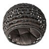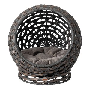 The Huntley Pet Rattan Cat Condo bed offers a comfortable and relaxing sleeping pet bed for your furry friend. Constructed of woven rattan wicker, round design, and elevated for the perfect place for your pet to relax. The rattan wicker offers air to circulate through to provide clean, odorless ventilation. Each pet bed comes with a comfortable, soft cotton cushion that will make any cat excited to relax. Completed with a sturdy bottom woven base to provide a safe, skid free structure to hold your cat for hours. Color: Grey, Cushion Diameter is 15" Inches, Overall height 18" Inches, Overall width 16.5" Inches. Weights 4.6 lbs.
