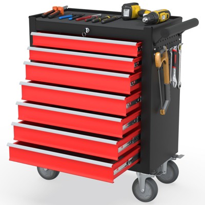 [Durable Material]Our rolling tool chest is made of thickened cold-rolled steel sheet, which is thicker and better than ordinary steel. Three layers of powder coating are applied to the surface of the steel sheet, which improves the surface color of the toolboxes and increases their durability. This material is extremely strong and durable and is ideal for use in a variety of indoor and outdoor applications. [Large Capacity]Equipped with a top work surface and 7 removable drawers, this tool box provides you with ample storage space to keep your tools and accessories organized. [Slides and Lockable]Each drawer is equipped with ball bearing slides, which makes the drawers operate smoothly and won't slam shut. It also comes with a key and lock to ensure your tool chest has a locking mechanism to protect your items. [Easy Mobility]The rolling tool box's 4 universal casters (2 of them with braking function) allow you to move and place the toolbox easily, bringing great convenience. [Widely Used]Our rolling tool box comes with detailed assembly instructions to make the assembly process easy, and has plenty of storage space to meet your needs in different occasions. Whether it is a garage, warehouse, workshop or repair shop, it can provide great convenience for your work.