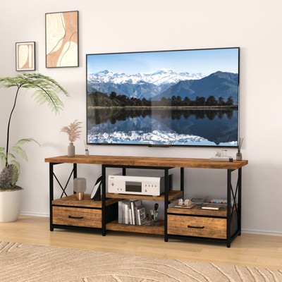 [Extra Drawer Storage] This TV stand is equipped with two fabric drawers, offering a smart solution for organizing various items. It keeps your belongings within easy reach, while ensuring they are safely stored away from children, helping to maintain a tidy and child-friendly space [Impressive Weight Capacity] With a sturdy top surface capable of supporting over 150 pounds, this TV stand with drawers provides reliable and secure support for your TV, giving you confidence in its stability. [Spacious Storage Options] Designed with ample storage space, this TV stand allows you to neatly organize your media devices, DVDs, gaming consoles, and other accessories. Create a clutter-free entertainment area where everything is organized and easily accessible. [Adjustable Feet] The adjustable feet of this TV stand for bedroom allow for precise leveling, ensuring stability on uneven floors while protecting your flooring from damage. [Easy Installation] This TV stand for living room comes with clear instructions and all necessary parts, making assembly quick and easy.