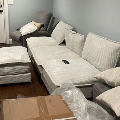 - Delivered in 3 Separate Packages: Considering the large volume of product packaging, in order to meet practical needs and facilitate transportation, this 4-seater L-shaped couch will be divided into 3 separate packages for delivery, so they may not arrive at the same time. Package 1: 2 single sofas and 2 throw pillows. Package 2: 1 single sofa and 1 ottoman. Package 3: left and right armrests for the couch